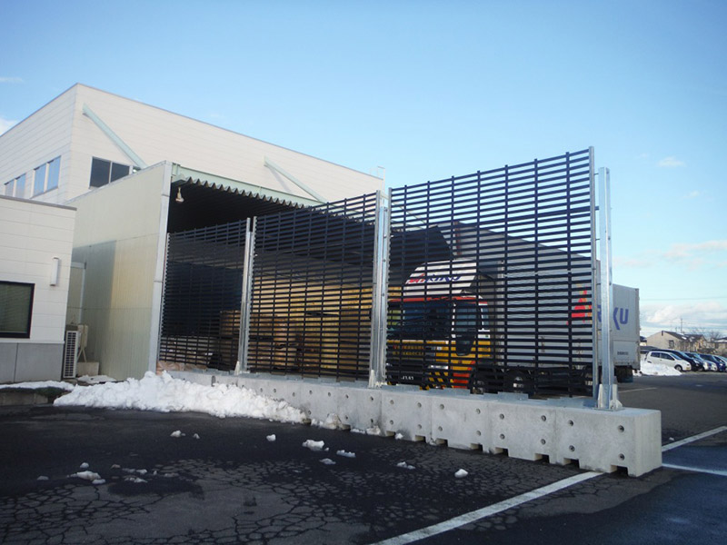 | 設置目的: | トラックターミナルの防風対策 プレキャスト製の置き基礎を用いることで短時間で設置が完了 不使用時は柵を取外し、基礎も移動可能 |