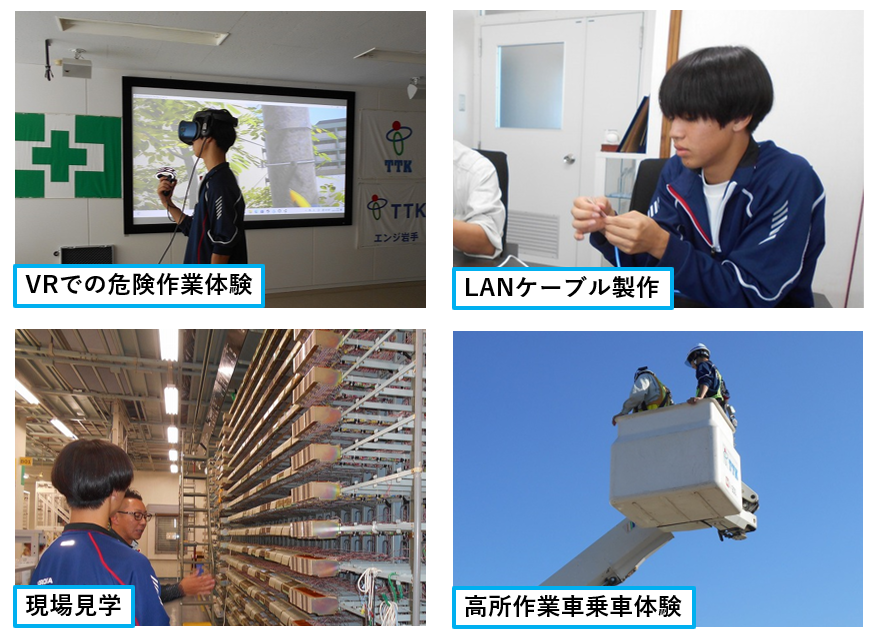 LANケーブル作製・高所作業車体験・現場見学等を実施し、仕事内容や職場の雰囲気を体験していただきました。
