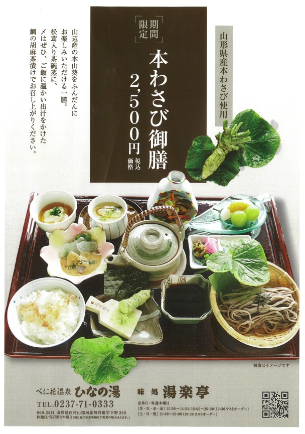 べに花温泉 ひなの湯様で、TTKエンジ山形の山辺わさびを使用した「本わさび御膳」がご提供中です。