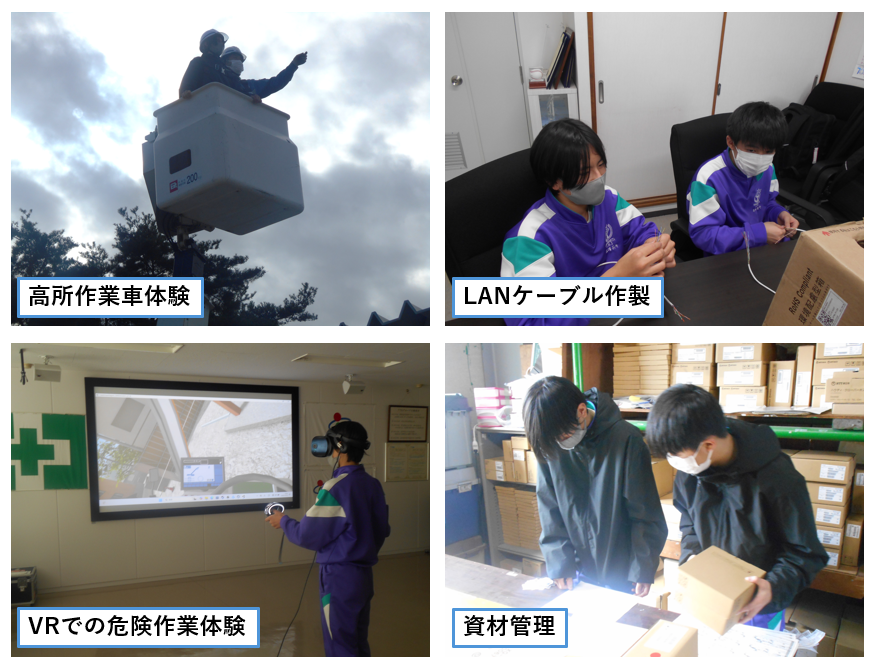 高所作業車体験・LANケーブル作製・VRによる危険作業体験・資材管理業務等を行い、楽しみながらエンジ岩手の業務内容や電気通信の重要性について理解を深めていただきました。
